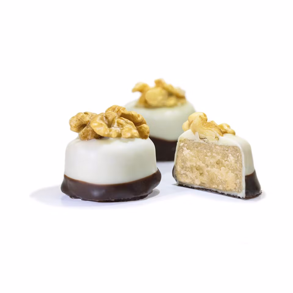 Ingredienser: MANDLAR (25%), socker, VALNÖTTER (24%), kakaosmör, vatten, HELMJÖLKSPULVER, kakaomassa, invertsocker, glukossirap, fuktighetsbevarande medel (sorbitol), emulgeringsmedel (SOJALECITIN), naturlig vaniljarom. Kan innehålla spår av GLUTEN och andra NÖTTER.