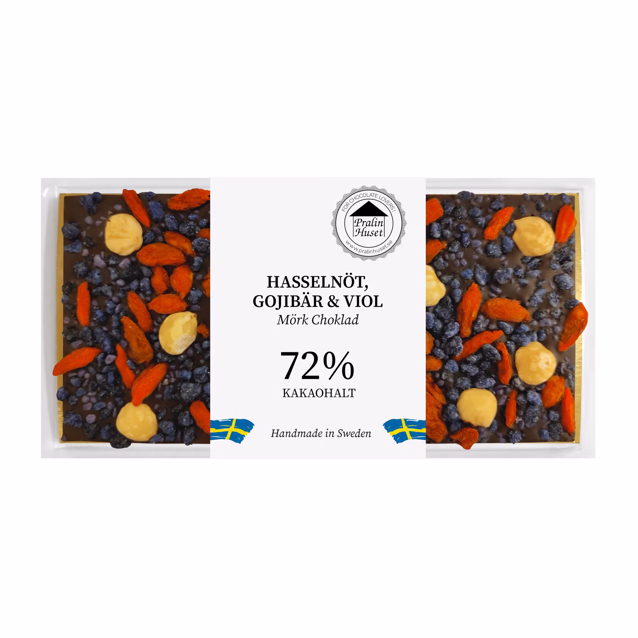 En kartong innehåller 10st chokladkakor. Pralinhusets egna 100 grams chokladkaka i mörk choklad.