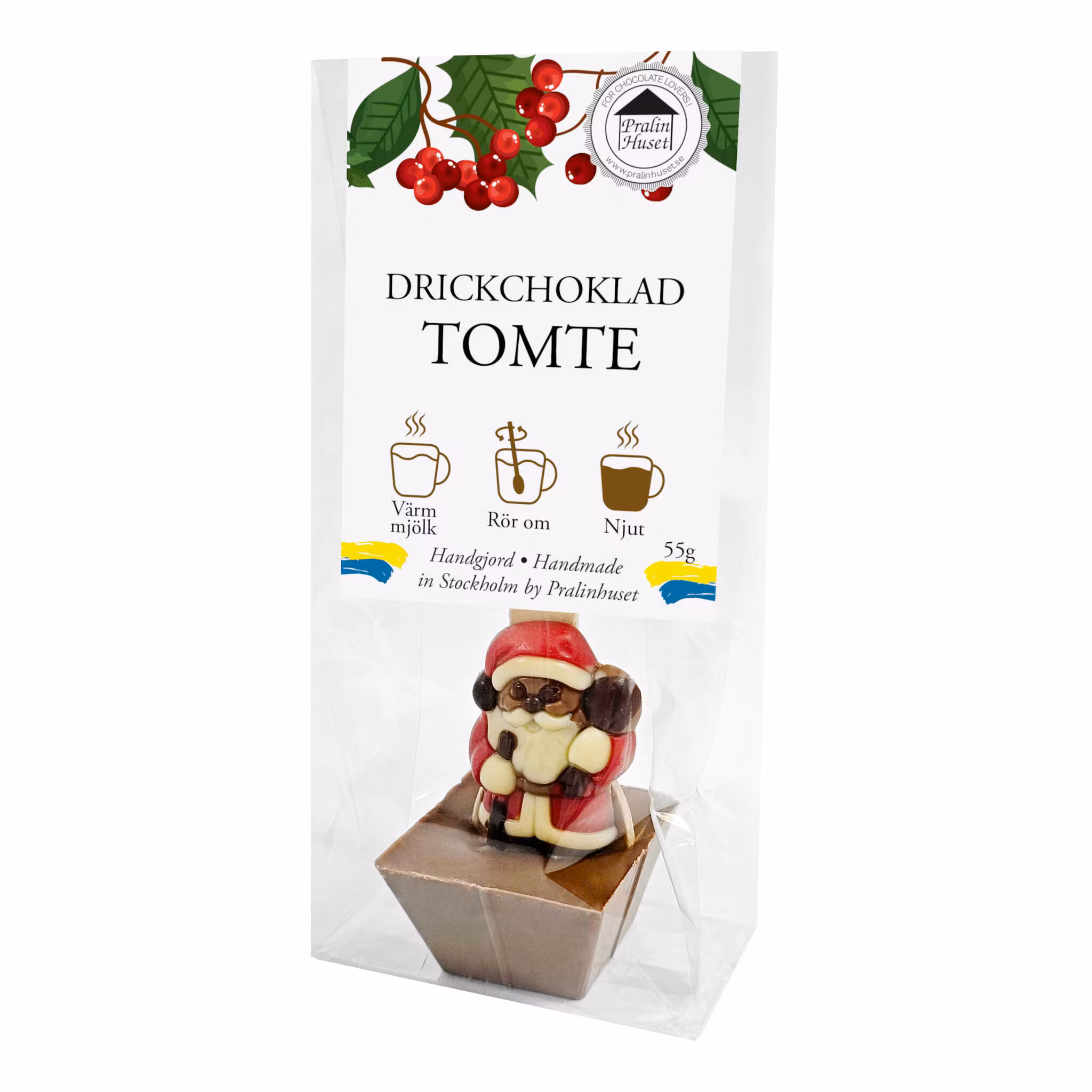 Pralinhusets handgjorda drickchokladklubbor finns i många spännande smaker. Låt den underbart lena chokladen smälta i en kopp varm mjölk, rör om, och njut. För variation, byt ut den varma mjölken mot en kopp kaffe.