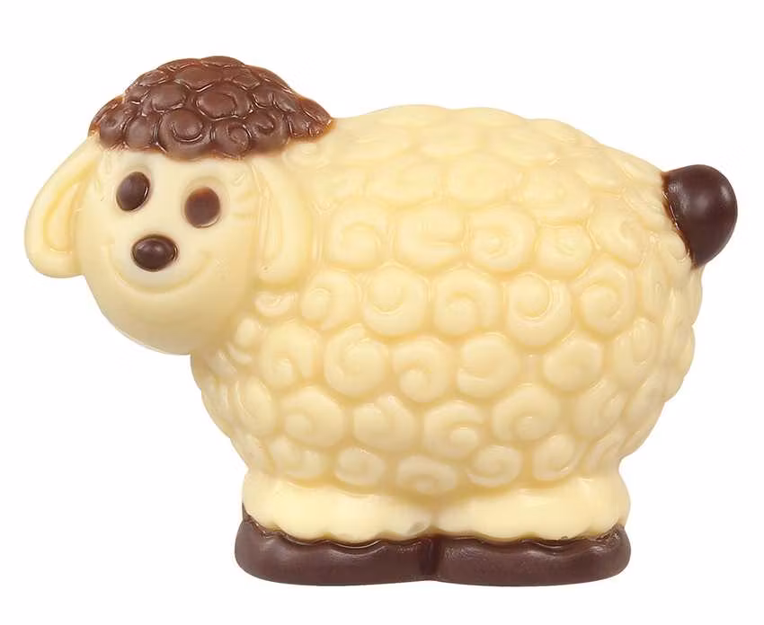 Packas individuellt i påse med klipp - 10st figurer i en kartong. Chokladmotiv i form av ett får dekorerade med vit och ljus choklad, samt dekorationsfärg.