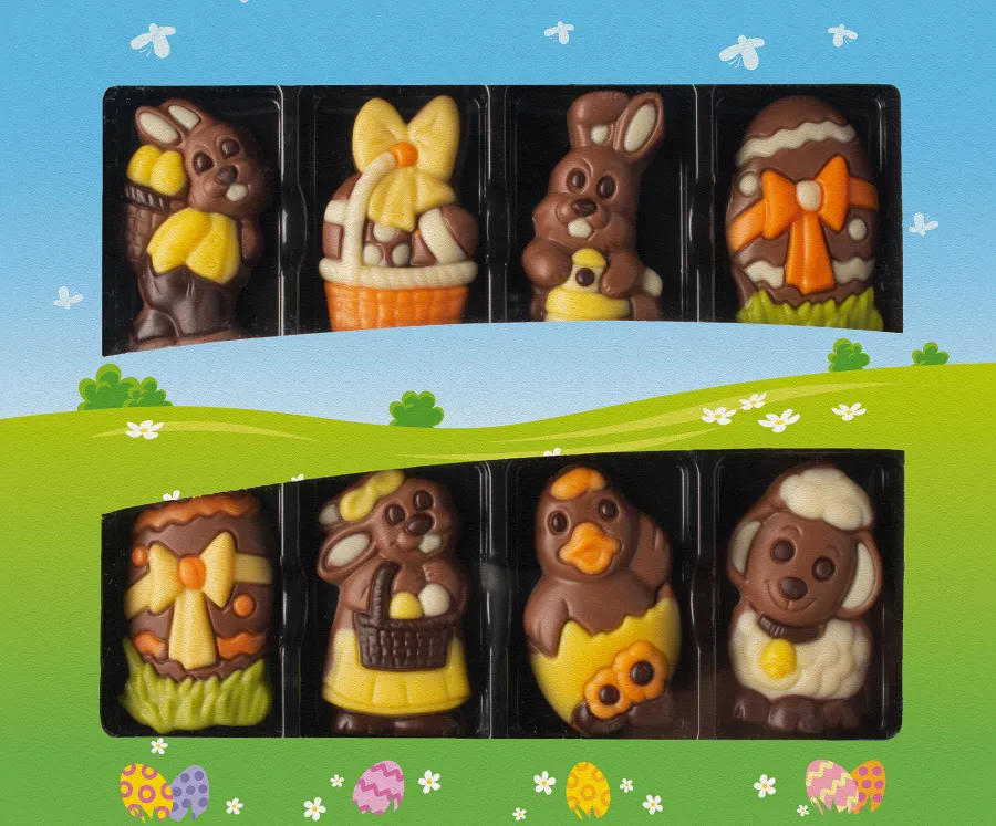 Packas 8 st i en kartong. Presentask med chokladfigurer i olika påskmotiv. Chokladfigurerna är gjorda i mjölkchoklad som är dekorerad med vit och mörk choklad, samt dekorationsfärg.
