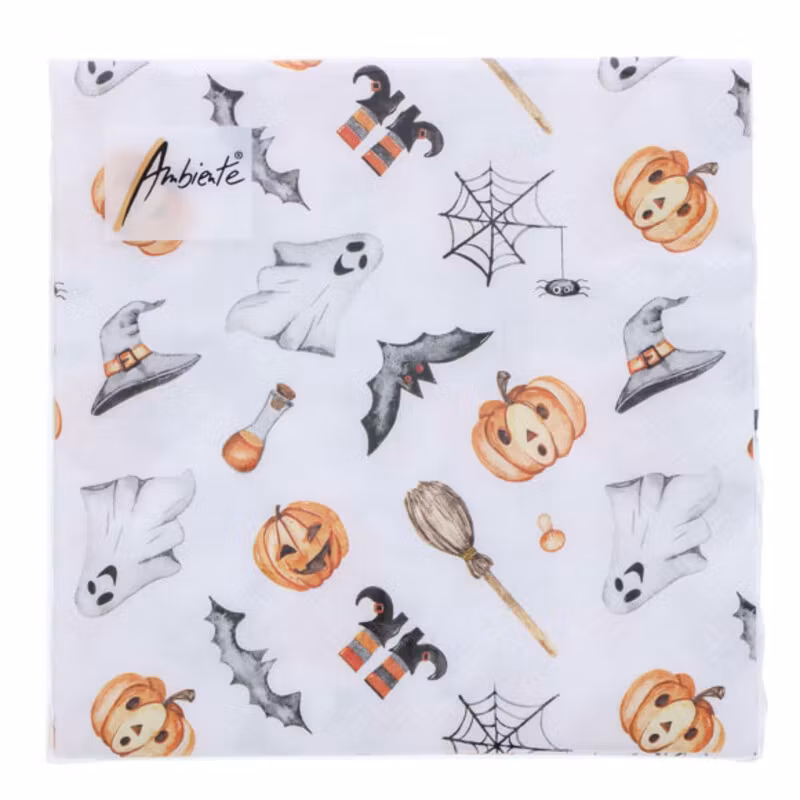 Dessa pappersservetter pryds av lekfulla Halloweenillustrationer med pumpor, spöken, fladdermöss, häxhattar och spindelnät. De balanserar perfekt mellan kusligt och glatt, vilket gör dem idealiska för ett Halloweenbord som uppskattas av både barn och vuxna.