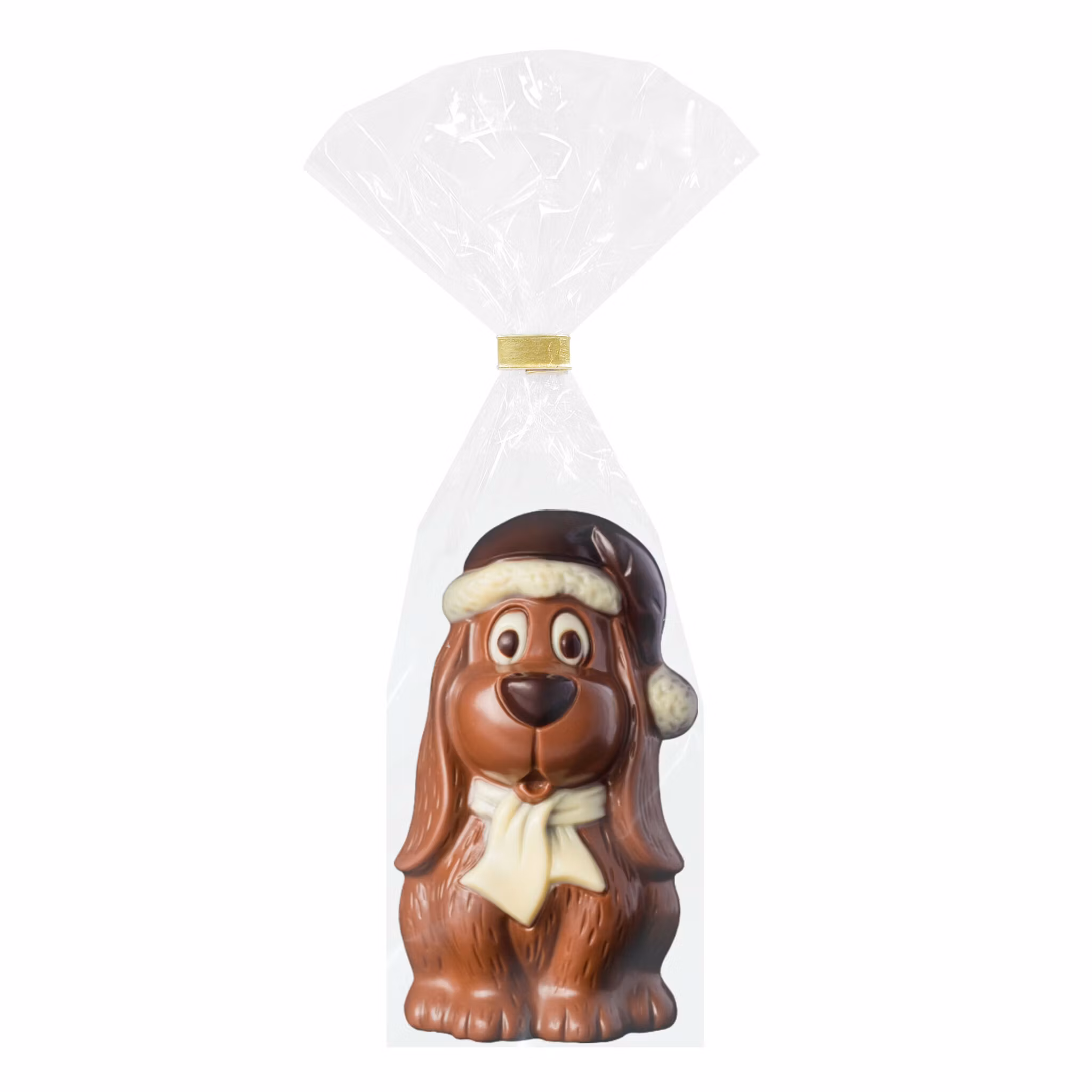 Packas 10st i en kartong. Chokladmotiv i form av en hund som är dekorerade med vit och mörk choklad. Choklad med min 36% kakao.