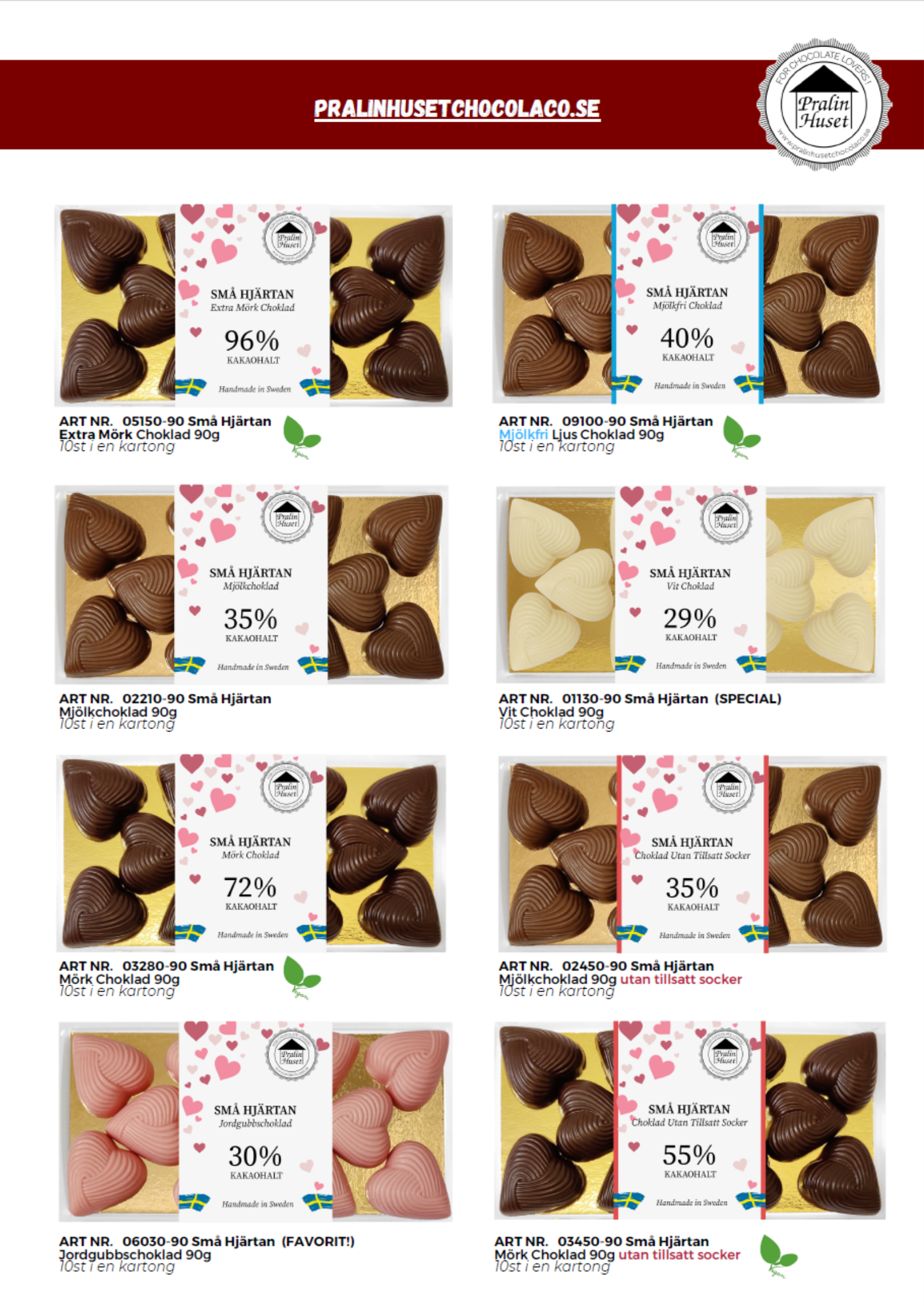 Här hittar du vårt breda standard-sortiment med allt från chokladkakor till drickchoklad och lakrits. Du hittar även en mängd mjölkfria, veganska alternativ samt choklad utan tillsatt socker.